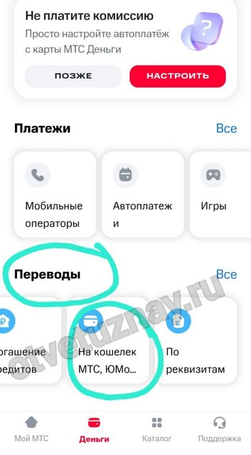 далее очень важно пролистать страницу вниз и уже в самом низу будет подзаголовок «Переводы«, далее будет строка с предложениями, куда перевести. Нужно листать слева направо эту строку, и также ближе к концу будет окошечко где написано «На кошелёк МТС, ЮМoney«.