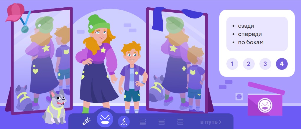 Выбери, где Олесе и Пете разместить световозвращающие элементы, чтобы стать заметными со всех сторон для водителей.