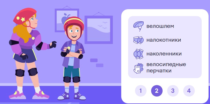 Олеся поедет на велосипеде, а Петя — на самокате. Выбери набор экипировки, чтобы их поездка была более безопасной.