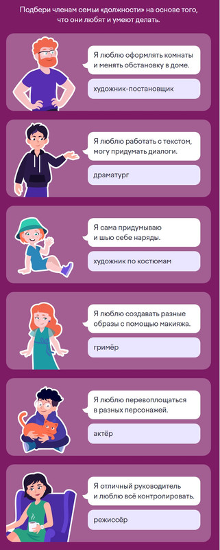 3. Домашний спектакль. По описанию будет понятно, где художник, где актер, а где костюмер.